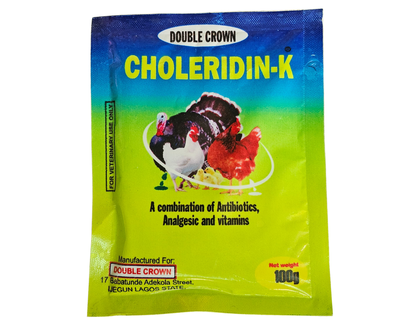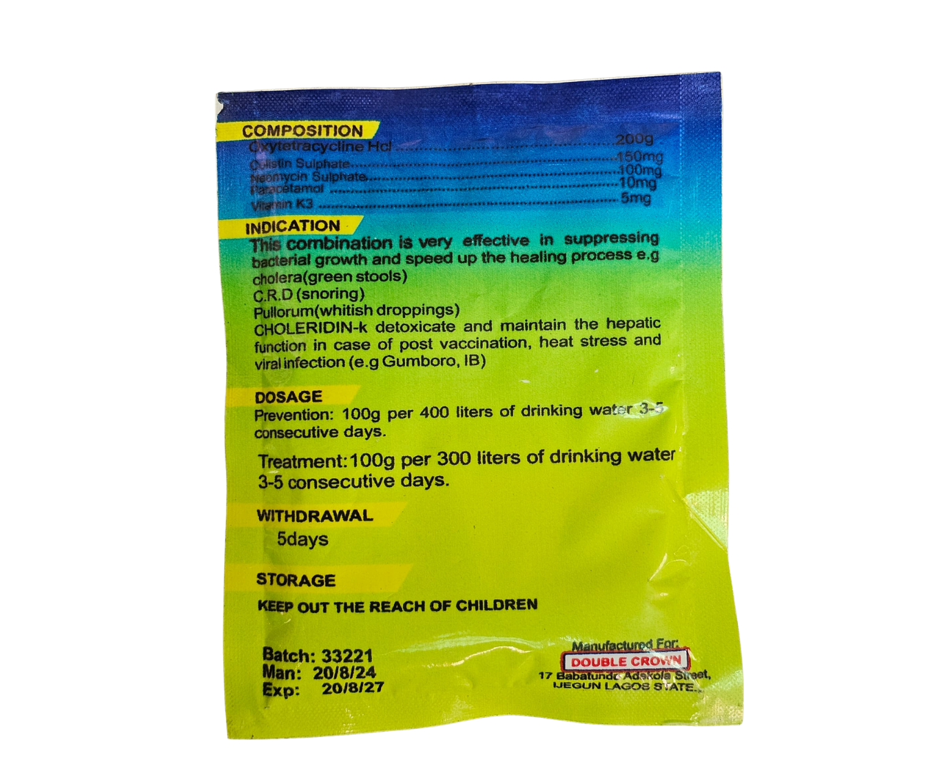Description: This combination is very effective in suppressing bacterial growth and speed up the healing process eg cholera (green stools), CRD, Pullorum. Choleridin K detoxicate and maintain the hepatic function in case of post vaccination, heat stress and viral infection (eg Gumboro, IB)