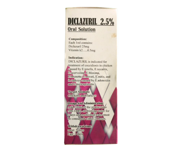 Description: Diclazuril is indicated for treatment of coccidiosis in Chicken caused by E. Tenella, E. Necatrix, E. Brunette, E. Mivati, E. Mitis, and in turkeys caused by E. Adenoides, E. Meleagridis.