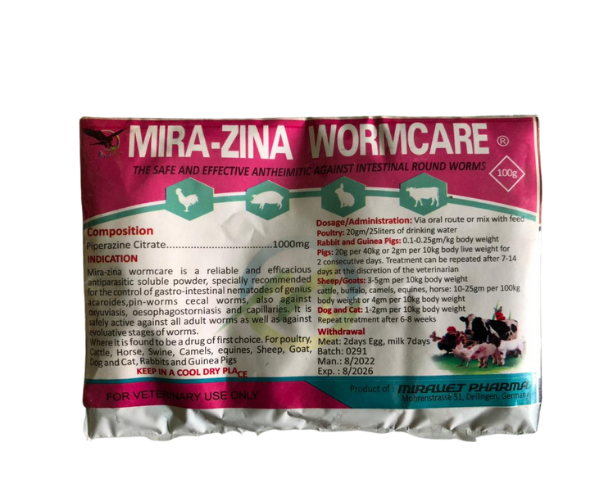Description: Mina Zina Wormcaee is a reliable and efficacious antiparasitic soluble powder, specially recommended for the control of gastrointestinal nematodes of genus acaroides, pin worms, cecal worms, also against oxyuviasis, oesophagostorniasis and capillaries. It is safely active against all adult worms as well as against evoluative stages of worms. Where it is found to be a drug of first choice. For poultry, cattle, horse, swine, camels, equines, sheep, dog and cat, rabbits and Guinea pigs.
