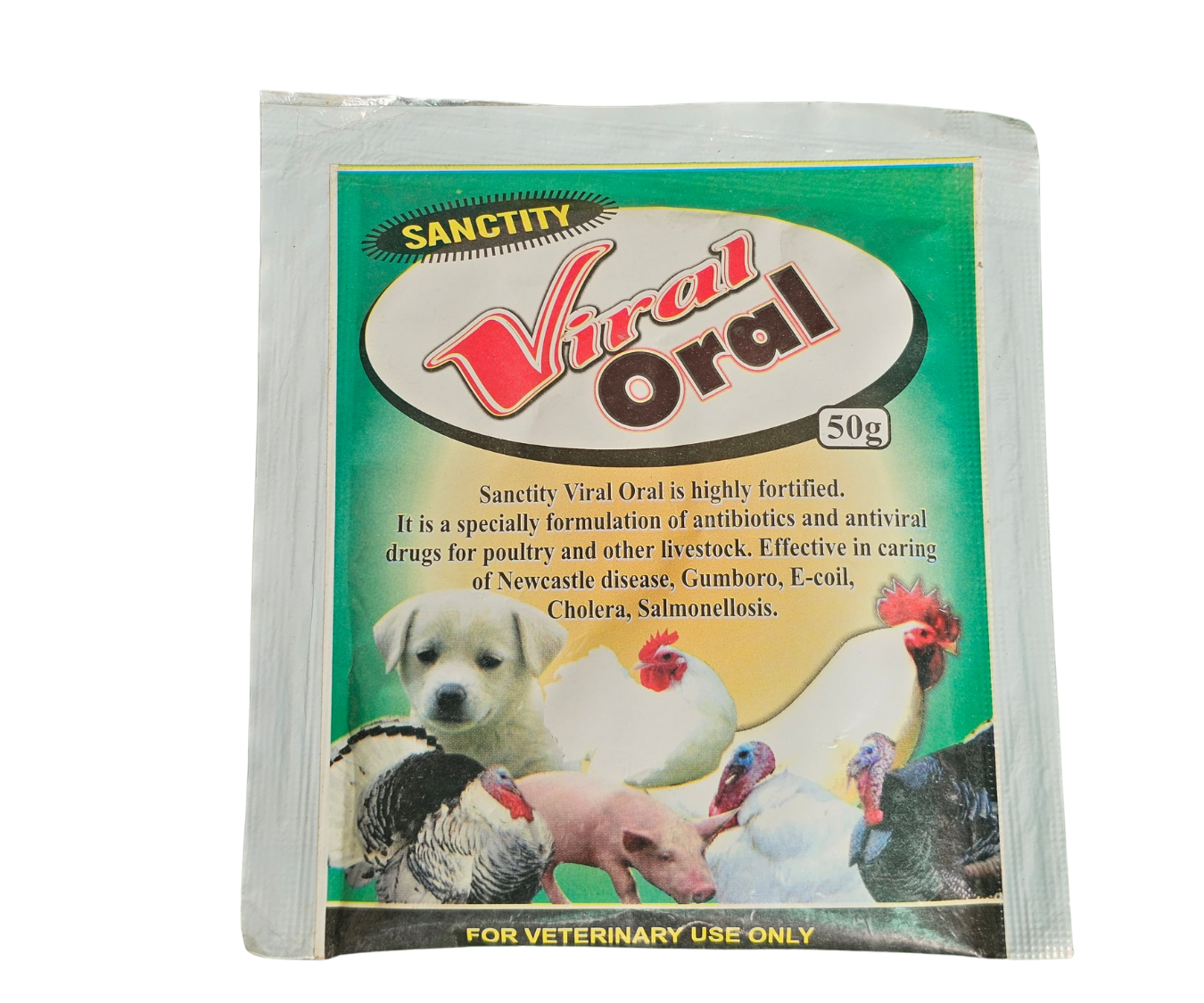 Description: Sancity Viral oral is highly fortified. It is a special formulation of antibiotics and antiviral drug for poultry and other livestock. Effective in curing of Newcastle Disease, Gumboro, E. Coli, Cholera, Salmonellosis.